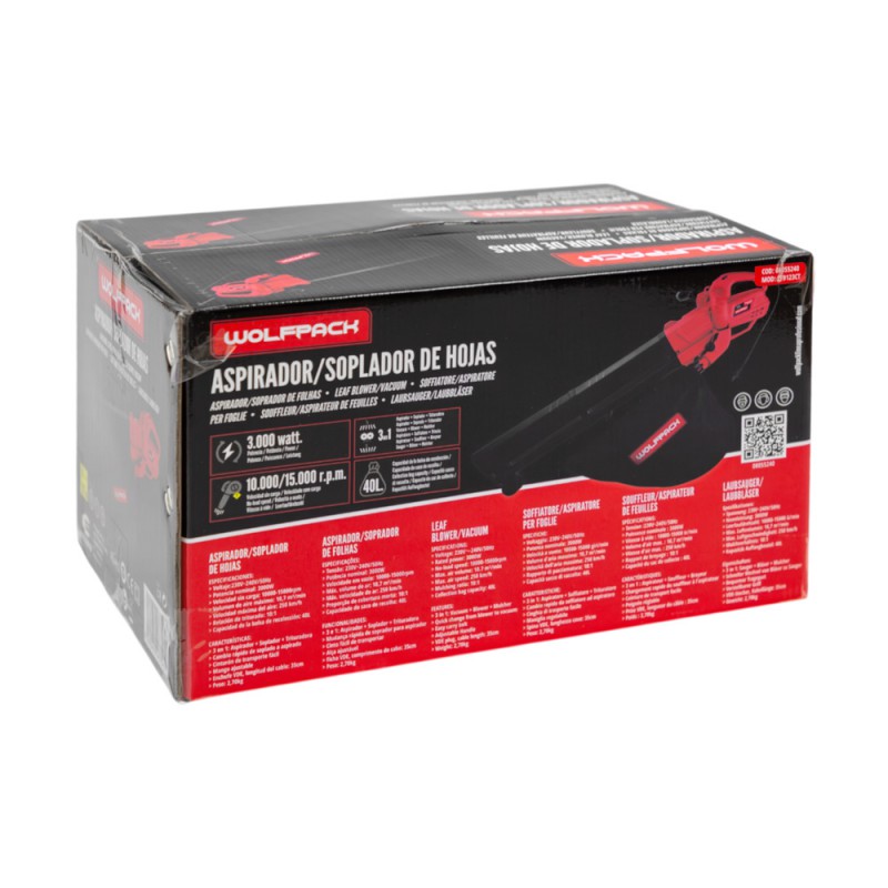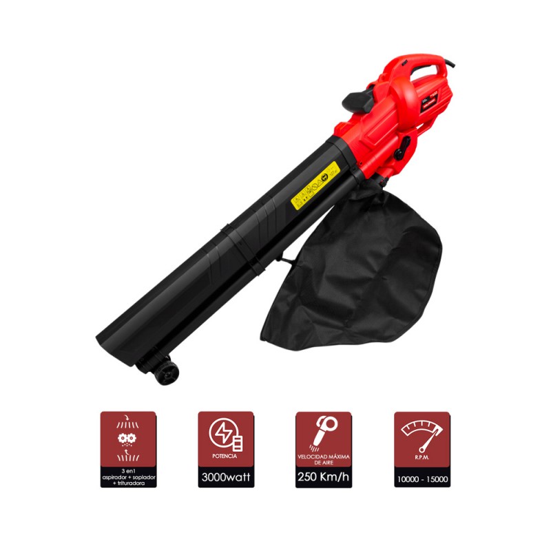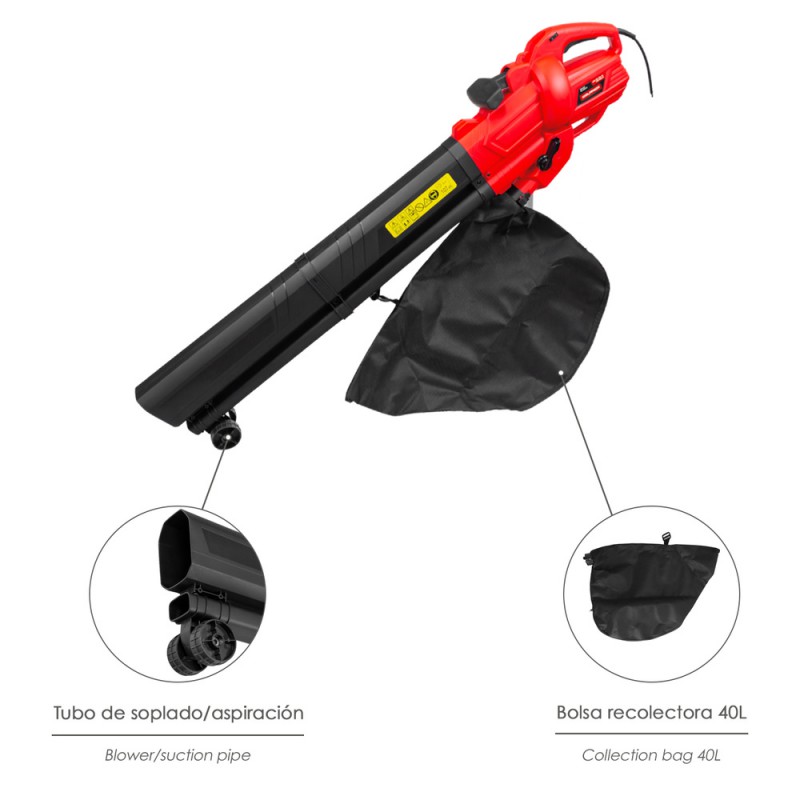 - Este versátil aspirador soplador cuenta con una bolsa recolectora de 40 litros de capacidad, la cual dispone de una práctica cremallera para facilitar su vaciado. Además, incorpora 2 ruedas guía que hacen más cómodo su desplazamiento durante la tarea de limpieza.