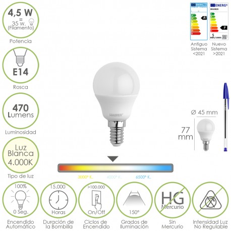 Bombilla Led Esferica Rosca E14 4.5 Watt. Equivale A 35 Watt. 470 Lumenes. Luz Neutra (4000º K)