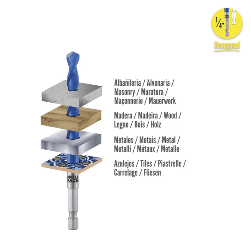 - Apta para la perforación de azulejos, cerámica, mármol, hormigón, metal, madera y plástico.