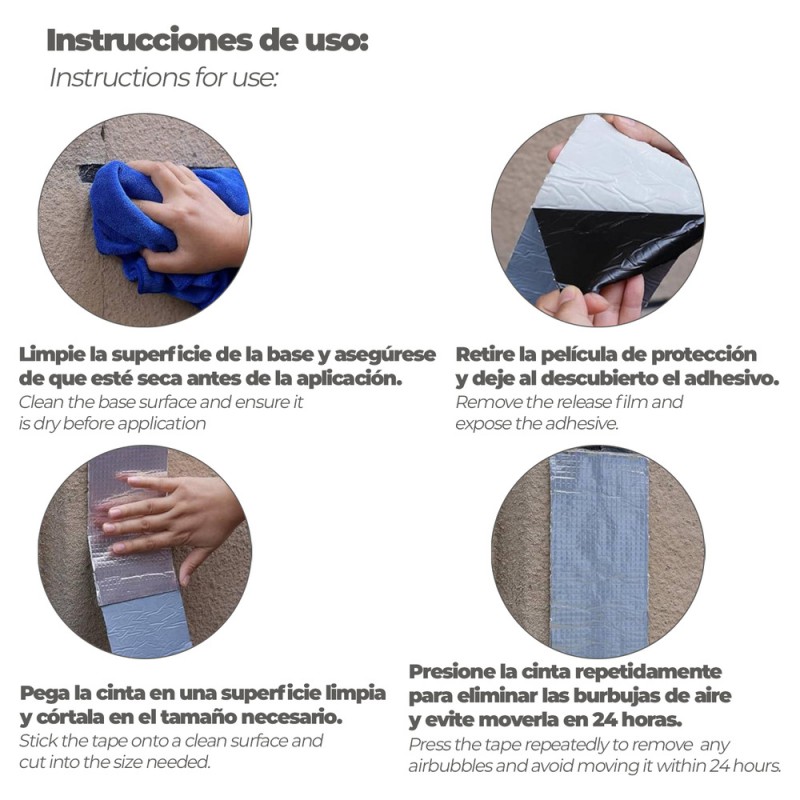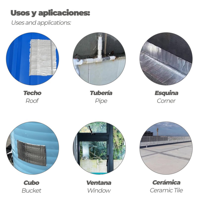 - Artículo también conocido como cinta butilo, cinta aluminio, cinta superimpermeable, cinta caucho, impermeable cinta butilo, cinta adhesiva aluminio, cinta adhesiva impermeable, cinta sellado butilo, cinta reparación, aluminio sellador, cinta butilica, etc.