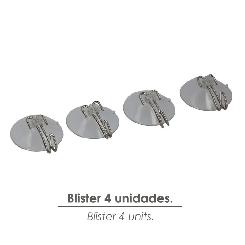 Colgador Oryx.- Con ventosa.- Medida: 38 mm.- Blister 4 unidades.- Artículo también conocido como perchas,perchita o gancho.