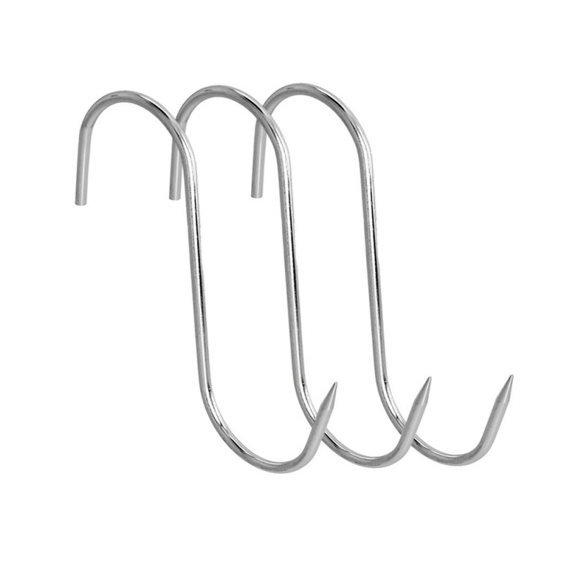 - Forma "S" con punta puntiaguda para facilitar el clavado en productos cárnicos.