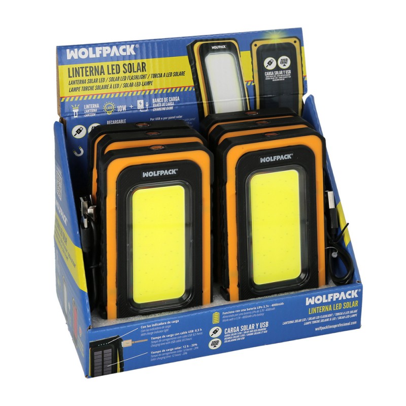 - Linterna recargable que se alimenta de energía solar o mediante conexión USB. Su potencia de 10W proporciona una iluminación potente y eficiente. Equipada con una batería LiPo de 3,7V y 4000mAh, garantiza una larga duración de uso.