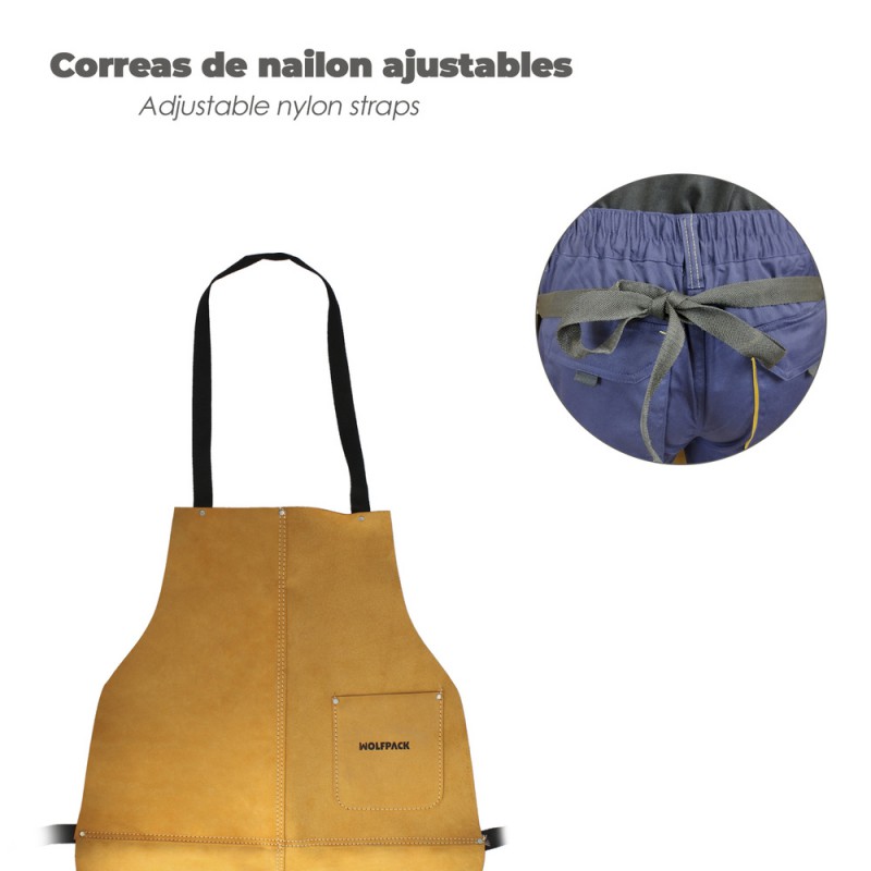 - Artículo también conocido como peto, peto cuero, delantal piel, delantal cuero, mandil.